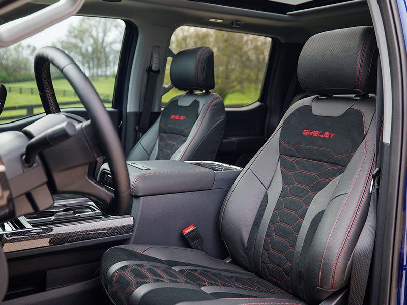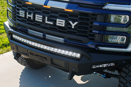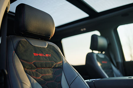 The exterior is purpose-built for adventure, with high-clearance front and rear bumpers, a replacement air-induction hood, painted fender flares, Shelby Baja bed chase rack with power-actuated LED lighting, and bold Shelby striping and graphics. Inside, premium leather seating, carbon fiber trim, billet pedals, and serialized Shelby badging elevate the driving experience.