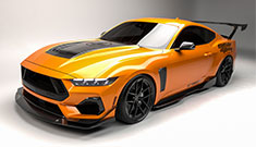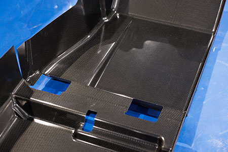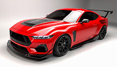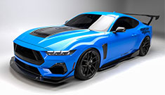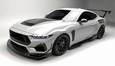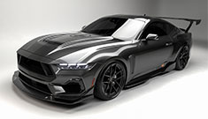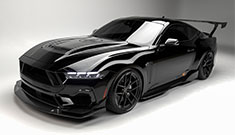 Downforce and airflow are optimized with an all-business carbon-fiber aero package: lower fascia splitter, right/left dive planes, upper and lower grille inserts, fender ducting, rockers with vertical stabilizers, adjustable Trans Am-approved rear spoiler, ducktail and a carbon rear diffuser with an integrated differential cooler.